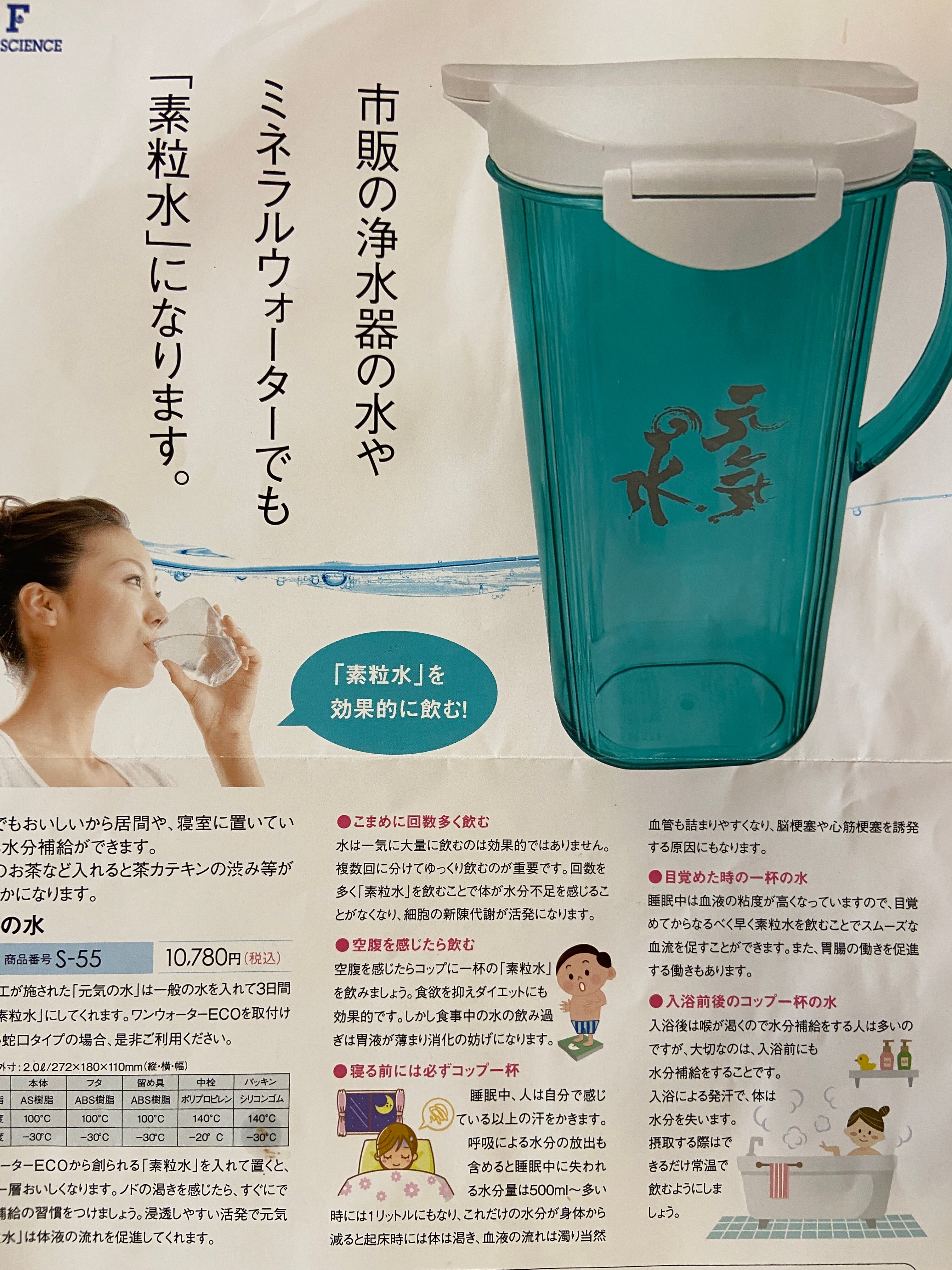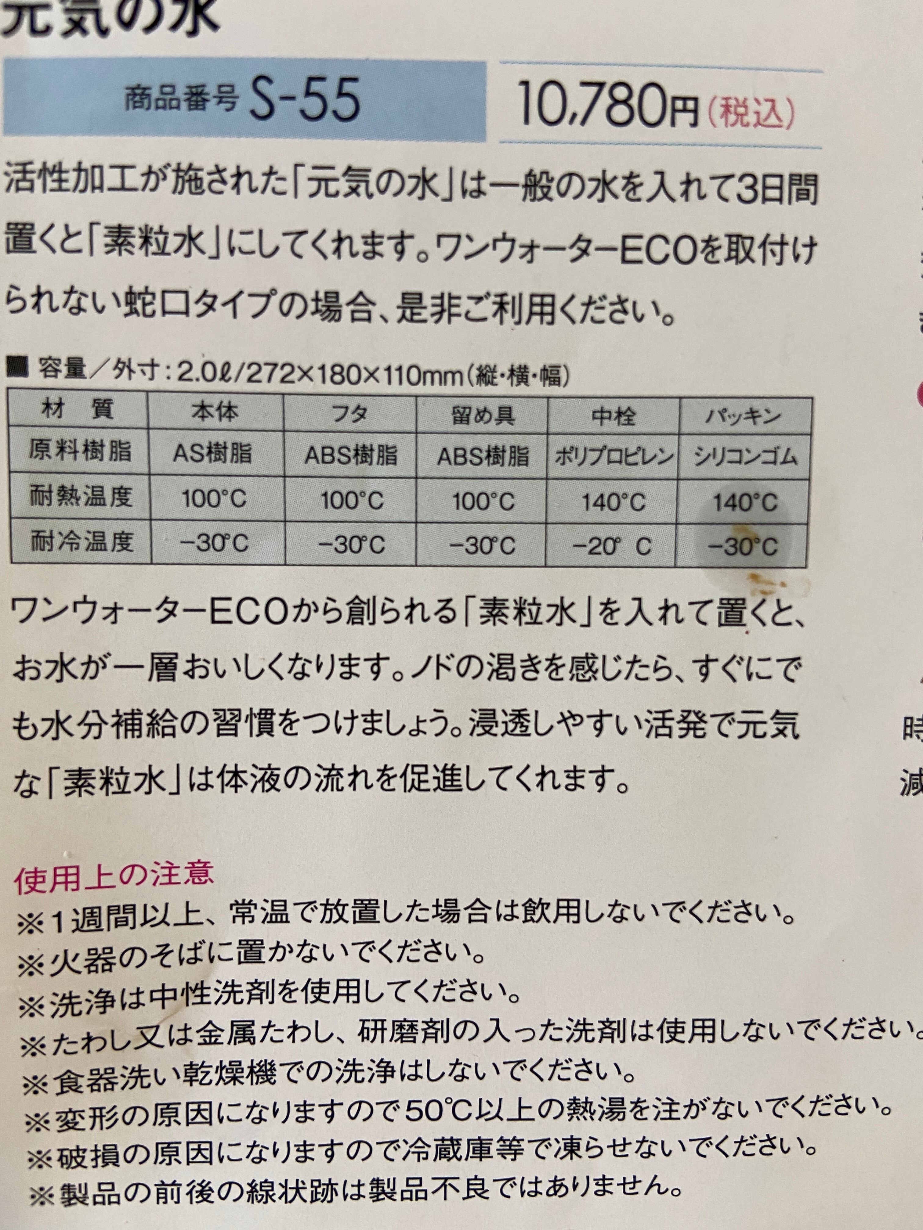 容器に活性加工が施された「元気の水」は一般の水を3日間置くと「素粒水」にしてくれます。ワンウォーターエコを取り付けられない蛇口タイプの場合、ご利用下さい。